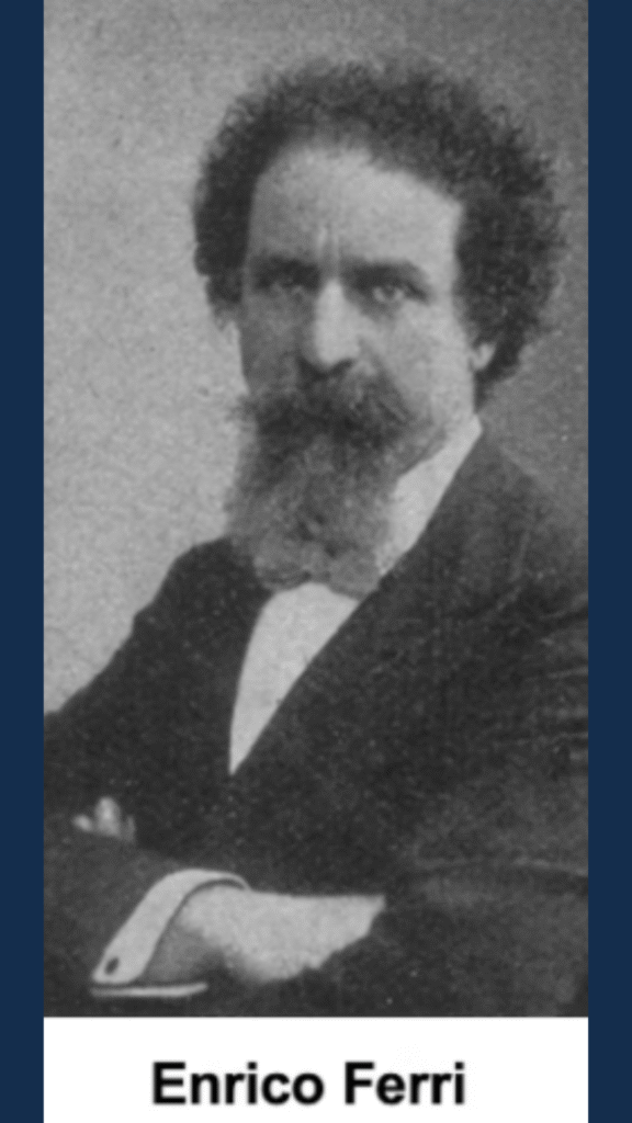 Enrico Ferri nasceu na Lombardia, Itália, em 1856, e faleceu em Roma, em 1929. Foi um importante criminologista italiano, de orientação socialista, considerado discípulo de Cesare Lombroso. Embora seguisse inicialmente os caminhos do mestre, Ferri diferenciou-se ao ampliar o campo de análise da criminologia. Enquanto Lombroso buscava fatores de ordem fisiológica, Ferri defendia a necessidade de considerar, no estudo do crime, os fatores econômicos e sociais que influenciam a conduta dos indivíduos.
